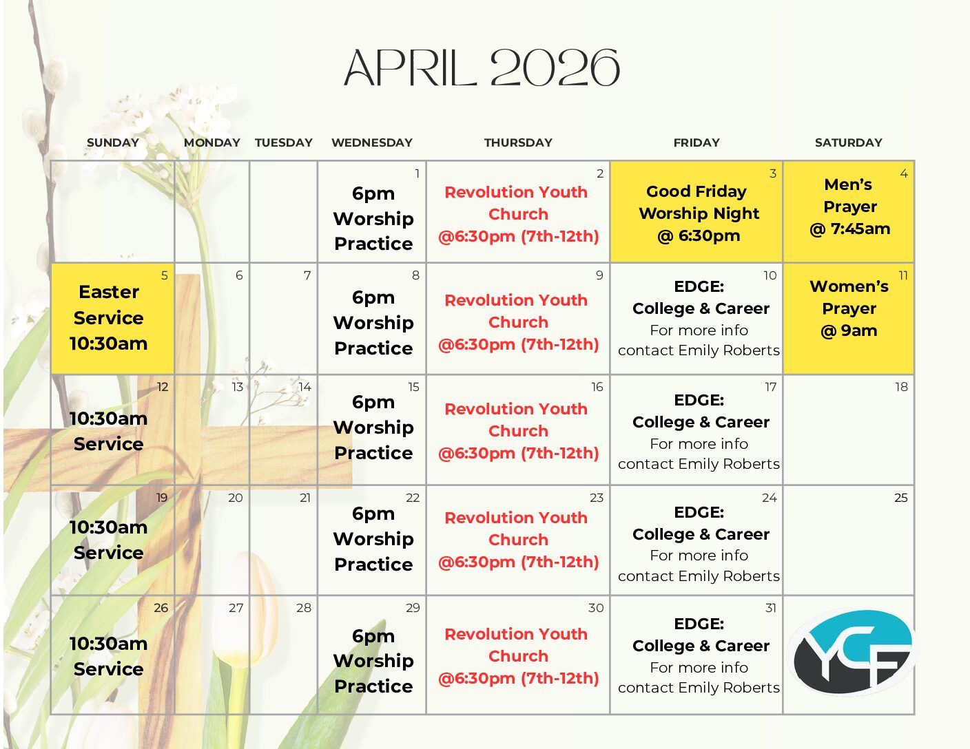 Our services are live streamed every Sunday at 10:30 AM on our YCF Facebook page.
